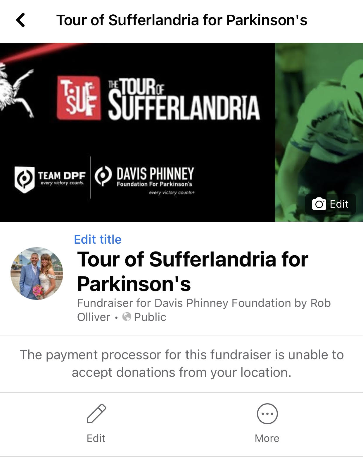 HI All, I have signed up for the ToS and tried to create a link to my Facebook account, it will be easier and more effective for fund raising than emailing people, but I get the message below in the screenshot, saying payment process is unable to accept donations from your location.