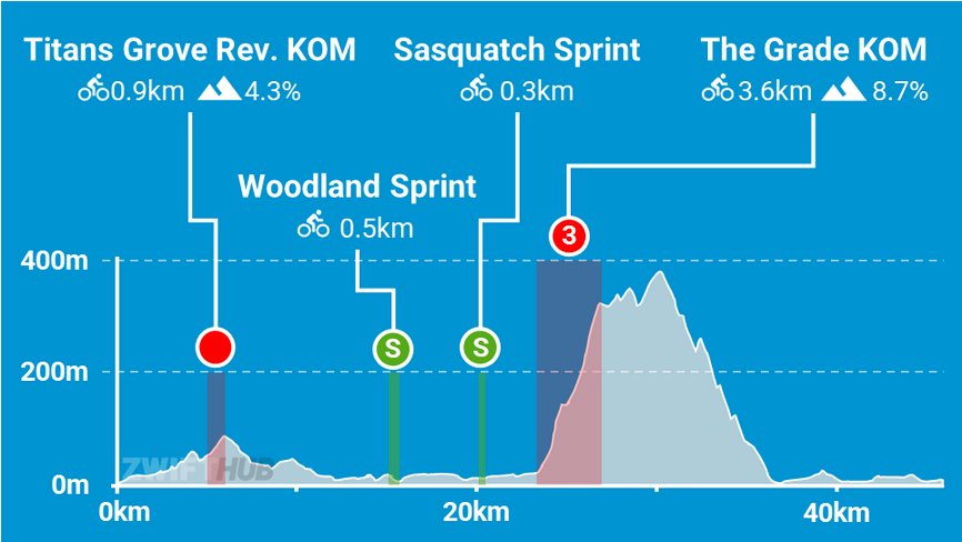 x2 KOM’s, including The Grade, with a final push over the backside of the Zwift KOM before a loooong downhill to the finish (bring that aero helmet!).