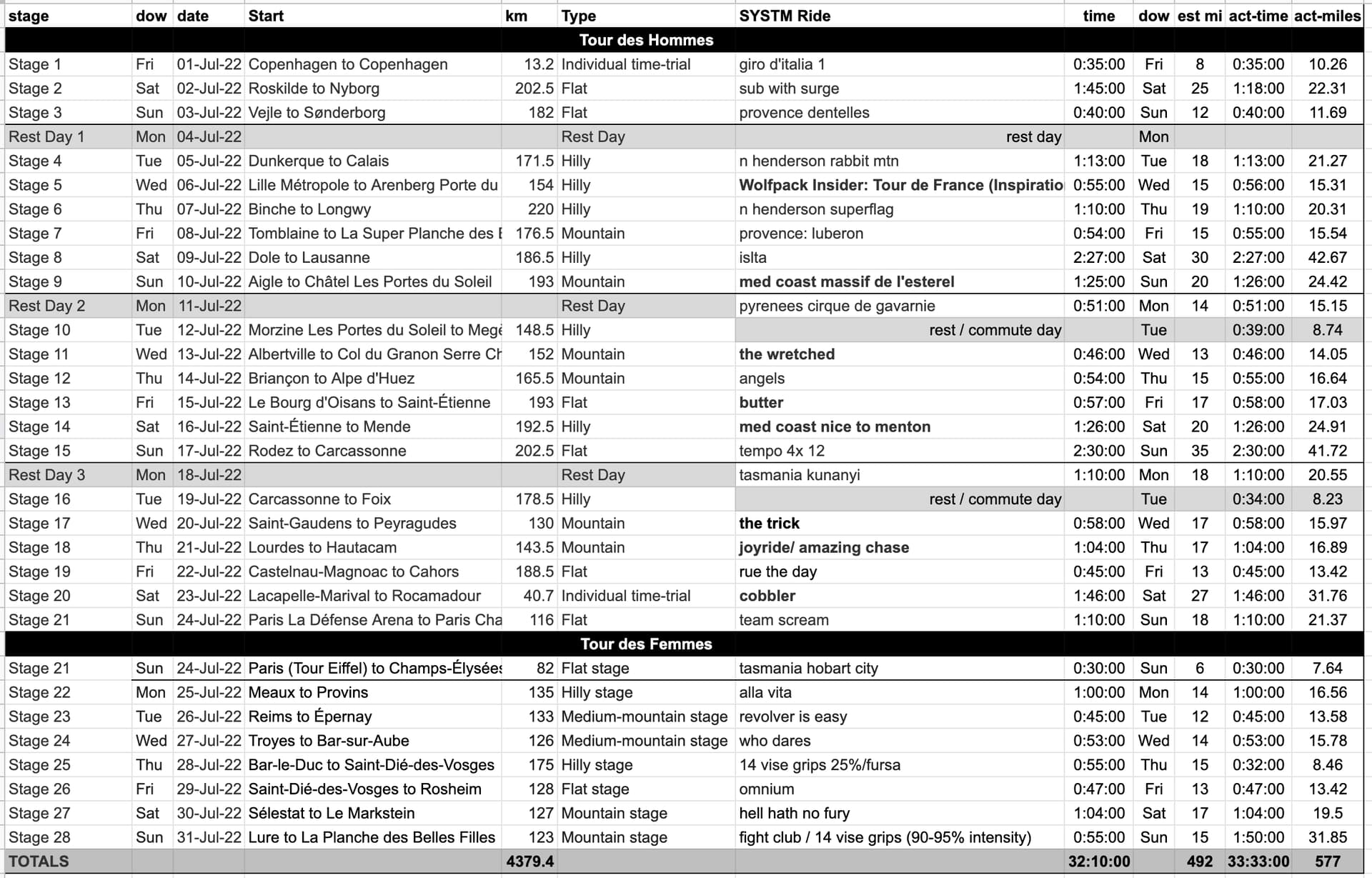 I finally finished my Tour de Home! Doing this made me much more likely to watch some of the highlights and live footage of the TdF and TdF Femmes, and also it was fun watching some of the same people racing the Tour a few years ago in the SYSTM videos.