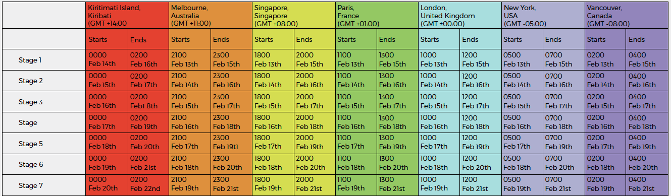 Here is the chart, wherever you are in the world as long as you complete the stage within the 50hour window you’re all good!