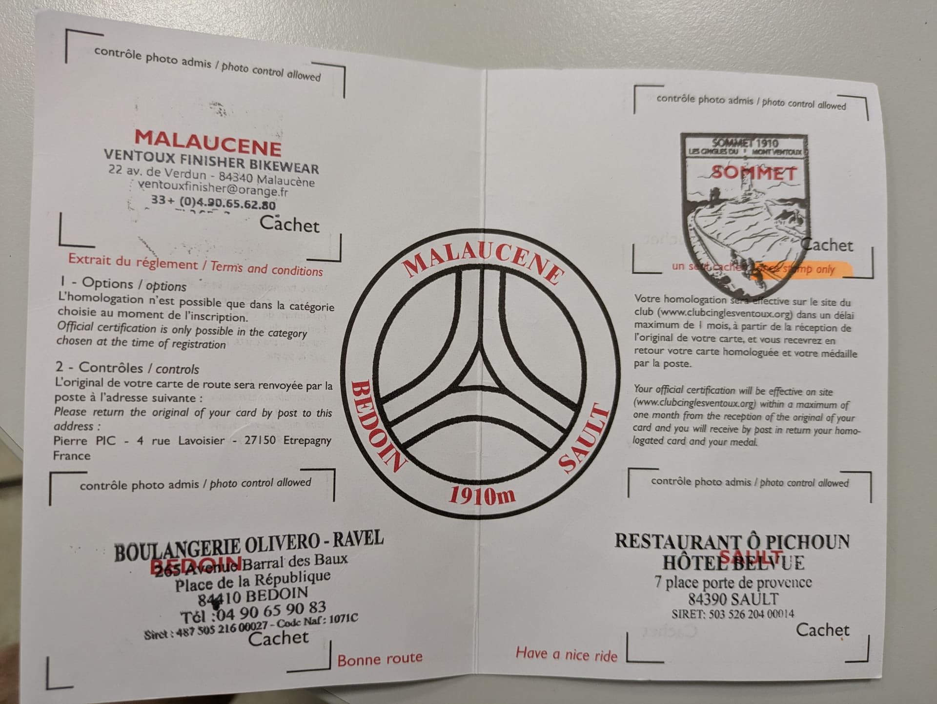 Then we set off. We get our first stamp at the boulangerie. The saleswoman wishes us ‘Bon courage!’ on our way. In front of the boulangerie, an elderly Frenchman asks us if we want to climb Ventoux three times. He gives us a thumbs up.